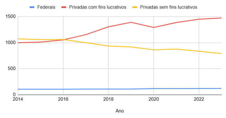 Com quase 68% de matrículas, o ensino privado prevalece como maioria. Apesar de que o setor conta com instituições com ou sem fins lucrativos, a constatação é de que o ingresso preponderante se dá mediante contrapartida financeira, o que por si só desconfigura o objetivo final, que deixa de ser o percurso formativo, passando a ser, grosso modo, a mensalidade do curso. Noutra clave, de mãos dadas com o número cada vez maior de matrículas, o número de IES no Brasil dentre os anos 2014 e 2023, mostra uma diferença na quantidade abissal entre público e privado: